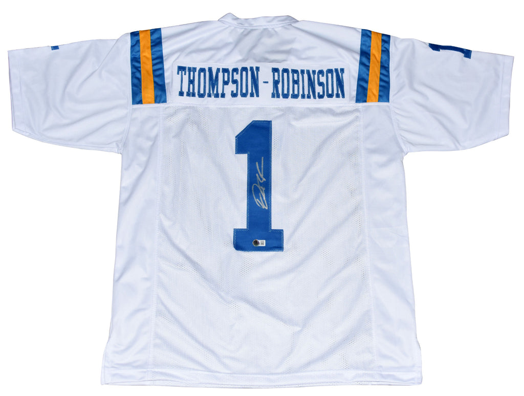 Dorian Thompson-Robinson, former star quarterback for the UCLA Bruins, has hand signed this custom jersey at a private signing. Jersey is size XL and all letters/numbers are sewn-on. This item is authenticated by Beckett Authentication Services and was signed in the presence of one of their representatives. Their tamper-evident hologram featuring a QR code and serial number is on the item. The authenticity can be verified online by entering the serial number or scanning the QR code.Item pictured may not be the exact item you will receive. It will be similar quality, and we guarantee your satisfaction.