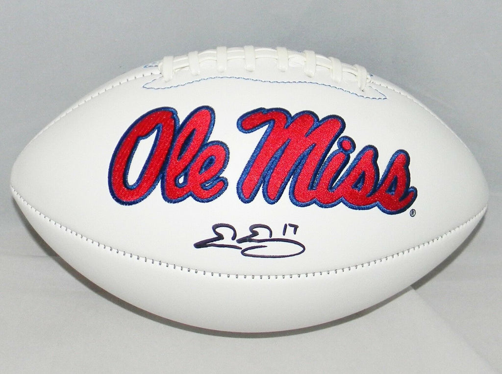 Evan Engram, former All-American tight end for the Rebels, has hand signed this Ole Miss white panel logo football at a private signing. This item comes with a certificate of authenticity (COA) from JSA - James Spence Authentication and was signed in the presence of one of their representatives. You will receive a serial-numbered COA along with a matching serial-numbered sticker on the ball. The authenticity can be verified online by entering the serial number.Item pictured may not be the exact item you will receive. It will be similar quality, and we guarantee your satisfaction.