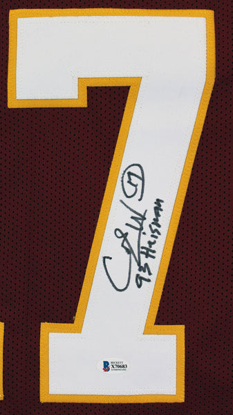 This Autographed Maroon Pro Style Framed Jersey with the inscription of "93 Heisman" has been Personally Signed by Charlie Ward of the Florida State Seminoles. This item is 100% Authentic to include a hologram by Beckett Authentication Services. This item may come with the new Beckett Authentication hologram that has a scannable QR code rather than the traditional COA. If you would like to have a COA, you are welcome to reach out to Beckett for a printed certification once you receive your item. This is a BAS Witnessed Protection Program item which means a Beckett Authentication Service representative was present when this item was being signed. We conducted an autograph signing with Charlie Ward where multiples of the same item were signed. While the photographs are representative of this item, the size, placement and strength of the signature may vary. Each item is hand signed, therefore, each autograph is unique. This item can be verified through BAS Witnessed. This item has been professionally framed to overall dimensions of approximately 32 x 37 inches. This is a X-Large sized, non-branded, custom-stitched Framed Jersey. These jerseys are framed to order, it takes approximately 3-4 business days for framing to be completed.