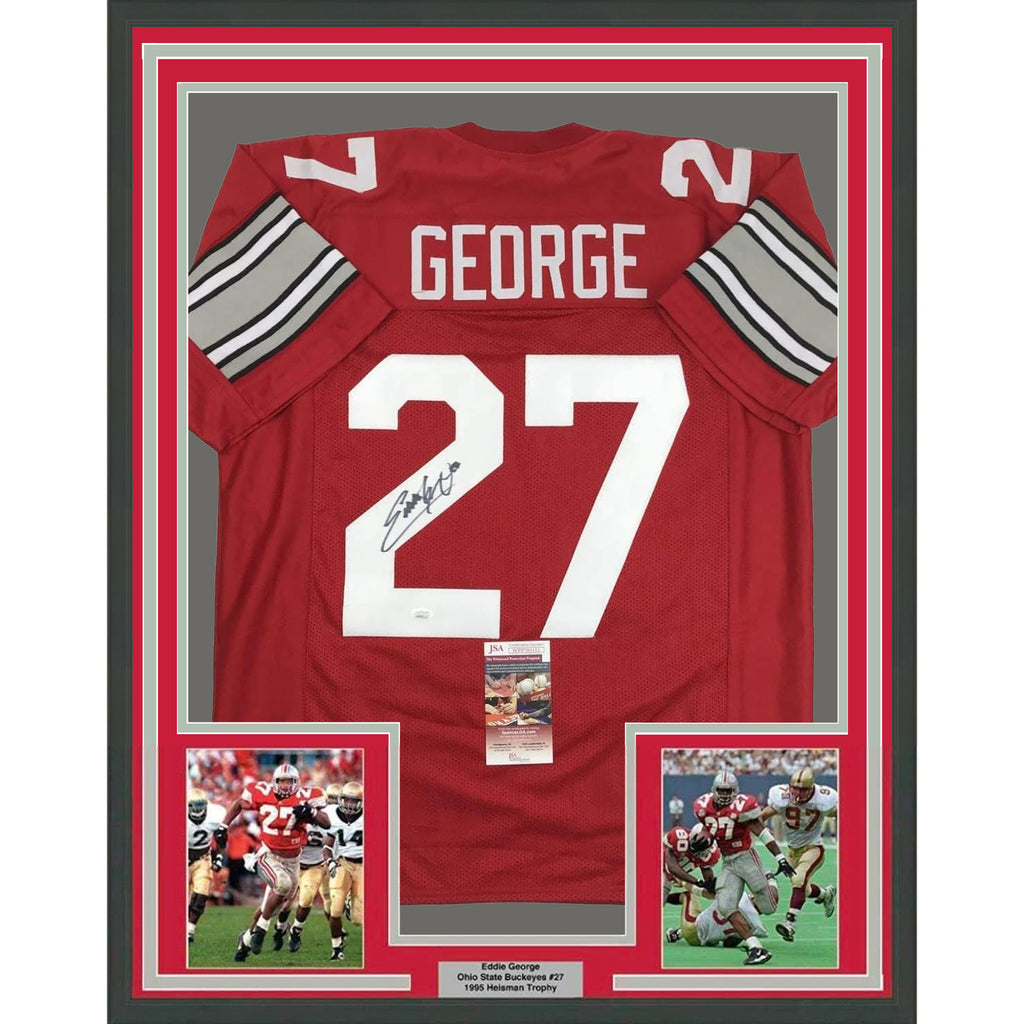Framed Autographed/Signed Eddie George 35x39 Ohio State Red Jersey JSA COA The item is professionally framed and matted with two 5x7 photos, measures 35x39 inches and is ready to be hung in your man cave! Photo and matting requests can be made.