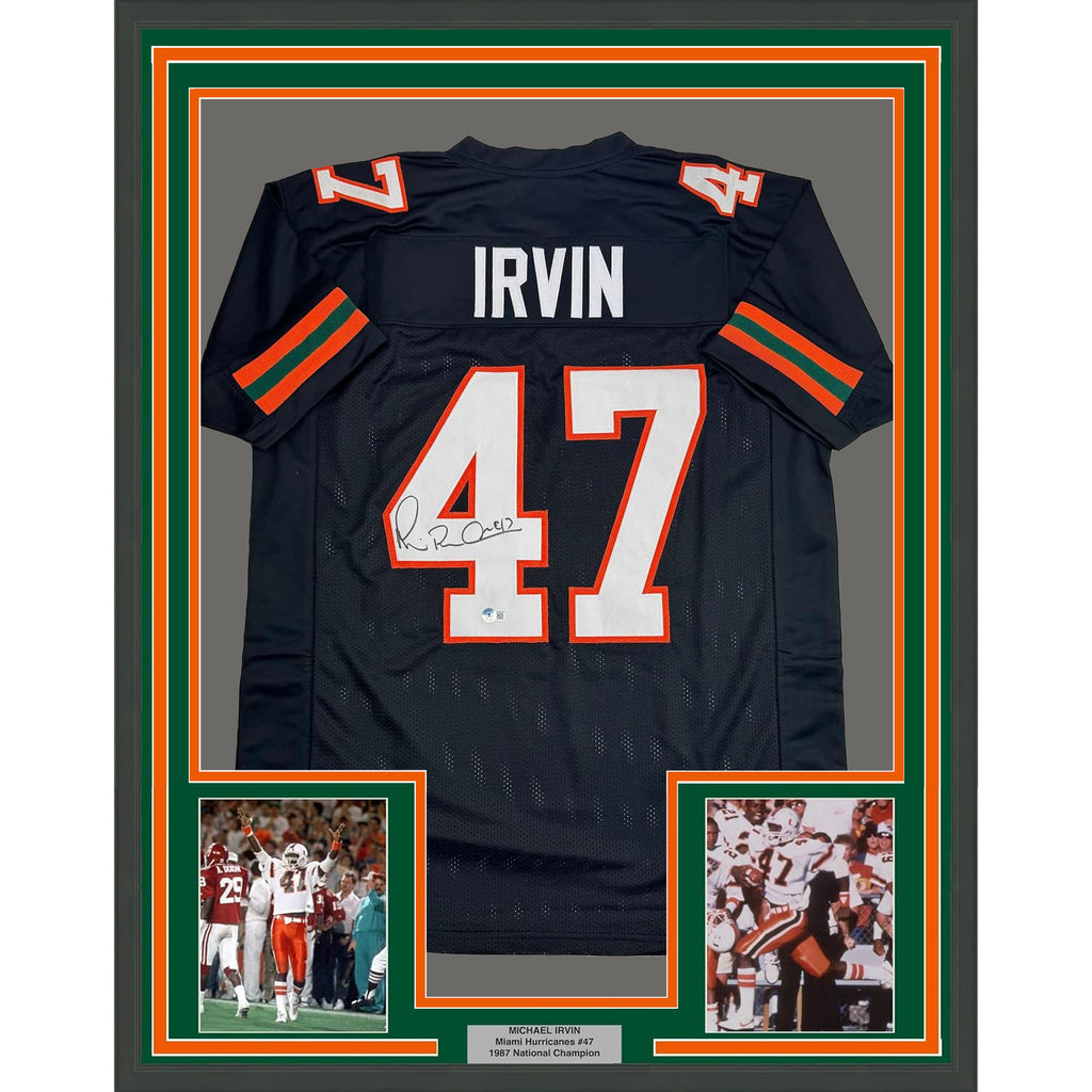 Framed Autographed/Signed Michael Irvin 35x39 Miami Black Jersey Beckett BAS COA The item is professionally framed and matted with two 5x7 photos, measures 35x39 inches and is ready to be hung in your man cave! Photo and matting requests can be made.