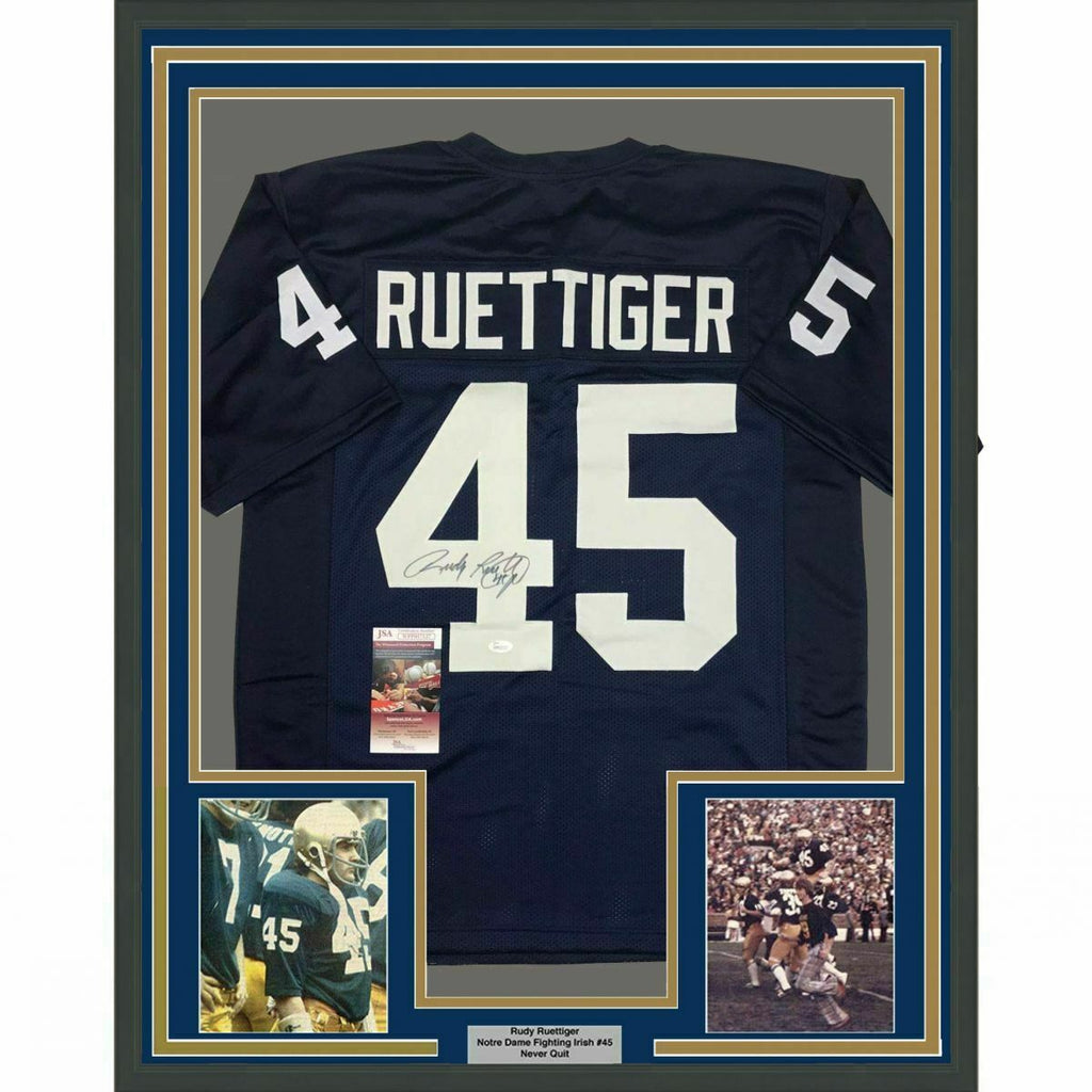 FRAMED Autographed/Signed RUDY RUETTIGER 33x42 Notre Dame Blue Jersey JSA COA The item is professionally framed & matted with two 8x10 photos, measures 33"x42" and is ready to be hung in your man cave! NOTE: COA card will be mounted on the back of the frame, not inside it on top of the jersey as seen in the picture.