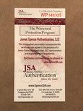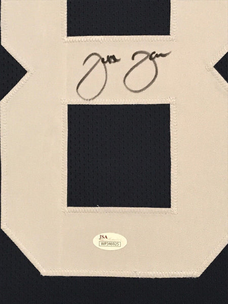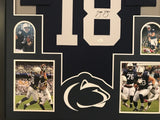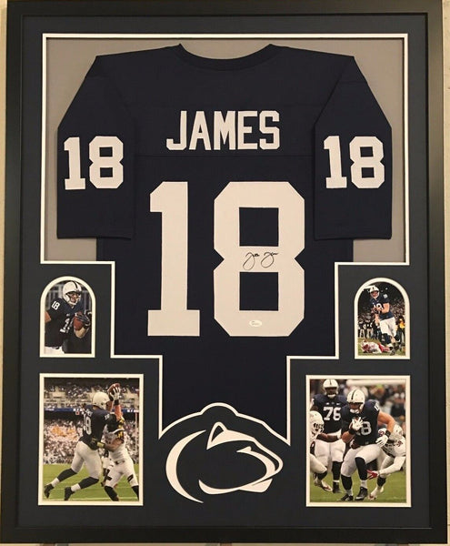 Framed Jesse James hand signed Penn State custom jersey. JSA Hologram and COA(WP346925) The authentication is from JSA. This signature is not authenticated by opinion but it is WITNESSED by a representative of JSA! 100% AUTHENTIC!!! The jersey has fully stitched numbers on the front and back. No tags or logos. This is not an official NCAA jersey but it is very high quality. It is a great item and a must for all great sports fans! This item is professionally framed, it measures 32"x40" inside , 42"x34" outside , using UV protective Acrylic glass for safe keeping and safe transport, team color matting, black moulding and hanging hooks on the back. All additional items in frame seen in pictures included. 100% ready to hang in your fan cave.