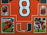 Custom Framed Duke Johnson hand signed Miami Hurricanes style custom jersey.Beckett Hologram and COAThe authentication is from Beckett. This signature is WITNESSED by a representative of Beckett! 100% AUTHENTIC!!! The jersey has fully stitched numbers on the front and back. It is a great item and a must for all great sports fans!Stock photos are used for auctions. Will receive equal quality.This item is professionally framed, it measures 32"x40" inside , 42"x34" outside , using UV protective Acrylic glass for safe keeping and safe transport, team color matting, black moulding and hanging hooks on the back. All additional items in frame seen in pictures included. 100% ready to hang in your fan cave.
