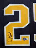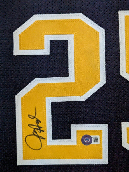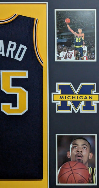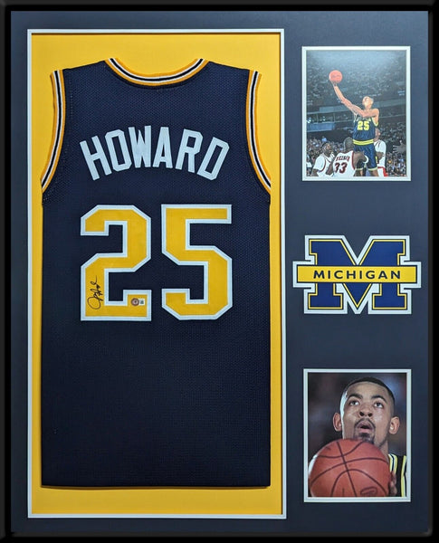 Custom Framed Juwan Howard hand signed Michigan Wolverines style custom jersey Beckett Hologram The authentication is from Beckett. This signature is WITNESSED by a representative of Beckett! 100% AUTHENTIC!!! The jersey has fully stitched numbers on the front and back. It is a great item and a must for all great sports fans! This item is professionally framed, it measures 32"x40" inside , 42"x34" outside , using UV protective Acrylic glass for safe keeping and safe transport, team color matting, black moulding and hanging hooks on the back. All additional items in frame seen in pictures included. 100% ready to hang in your fan cave.