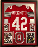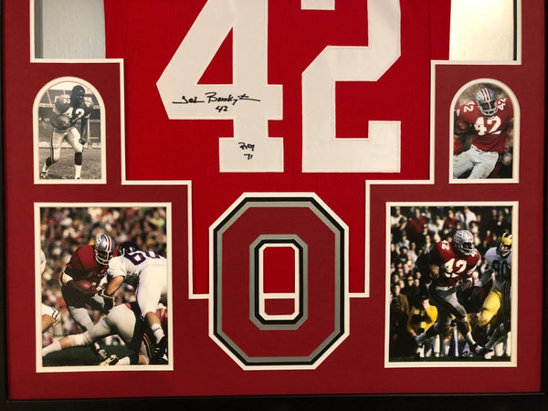 Custom Framed John Brockington hand signed Ohio State Buckeyes jersey.JSA Hologram and COA(#N33698)The authentication is from JSA. This signature is authenticated by a representative of JSA! 100% AUTHENTIC!!! The jersey has fully stitched numbers on the front and back. It is a great item and a must for all great sports fans!This item is professionally framed, it measures 32"x40" inside , 42"x34" outside , using UV protective Acrylic glass for safe keeping and safe transport, team color matting, black moulding and hanging hooks on the back. All additional items in frame seen in pictures included. 100% ready to hang in your fan cave.