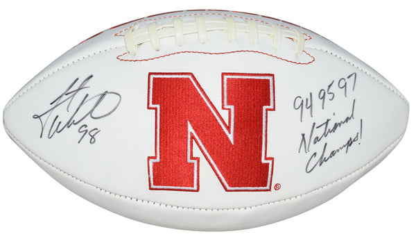 Grant Wistrom, former All-American defensive end for the Cornhuskers, has hand signed this Nebraska white panel logo football at a private signing. He included the inscription "94 95 97 National Champs!" with his signature. This item comes with a certificate of authenticity (COA) from Signature Sports Marketing, one of the leaders in the industry. You will receive a paper COA along with matching serial-numbered holograms.Item pictured may not be the exact item you will receive. It will be similar quality, and we guarantee your satisfaction.