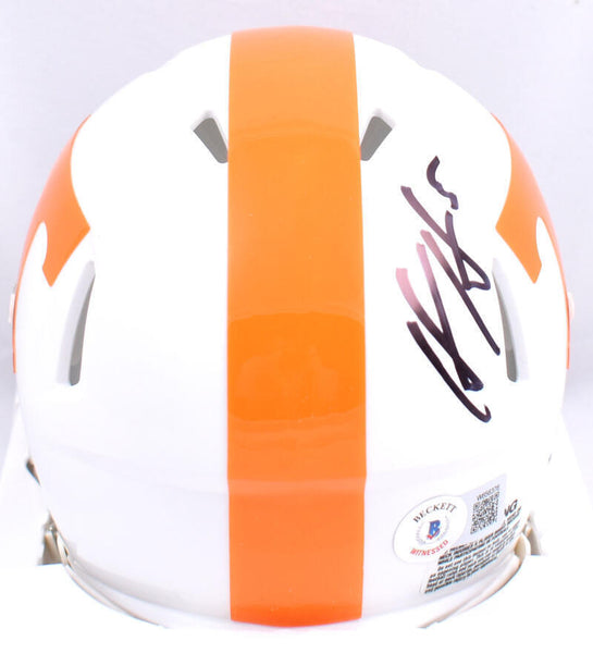 Hendon Hooker Autographed Tennessee Volunteers Speed Mini Helmet- Beckett W Hologram *Black This is a Hendon Hooker of the Tennessee Volunteers hand autographed Riddell speed mini helmet. This item has a Beckett Witnessed Authentication, which comes with a numbered hologram and a QR code for verification. You can view this item on the Beckett website. It was signed either at a public autograph appearance or a private signing. This is a stock photo of the item. Although you may not receive this exact item, the item you receive is virtually identical, brand new, and in great shape.