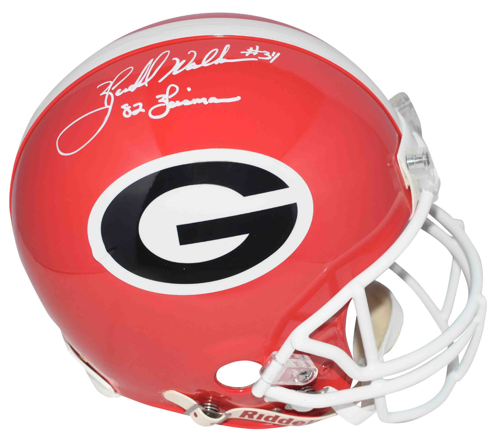 Herschel Walker, former Heisman Trophy winning running back for the Bulldogs, has hand signed this Georgia Riddell ProLine full-size authentic helmet at a private signing. He included the inscription "82 Heisman". This helmet is fully padded inside like the ones worn on the field. This item comes with a certificate of authenticity (COA) from Beckett Authentication Services and was signed in the presence of one of their representatives. You will receive a serial-numbered COA along with a matching serial-numbered sticker on the helmet. The authenticity can be verified online by entering the serial number.Item pictured may not be the exact item you will receive. It will be similar quality, and we guarantee your satisfaction.