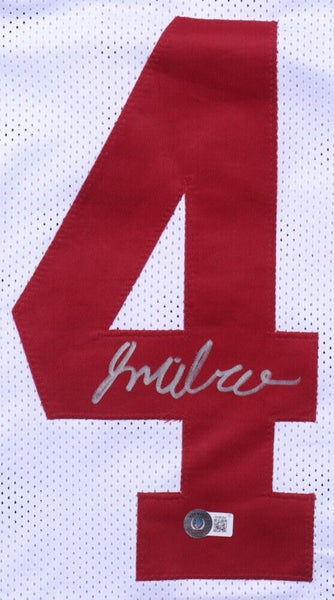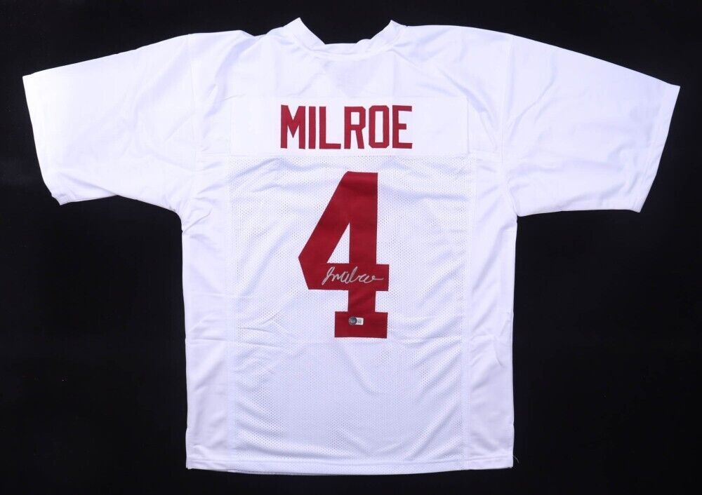 Custom on-field style jersey. Everything is sewn on, size XL. Hand-signed in silver paint pen by Jalen Milroe. The lot / autograph(s) includes an official Beckett Authentication Service (BAS) hologram and QR Code card for authenticity purposes. Authentication: Beckett Hologram with QR Code card