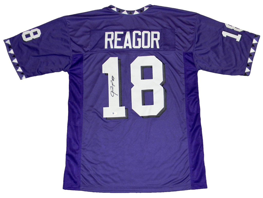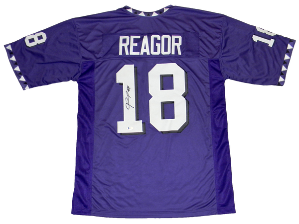 Jalen Reagor, former star wide receiver for the TCU Horned Frogs, has hand signed this purple custom jersey at a private signing. Jersey is size XL and all letters/numbers are sewn-on. This item comes with a certificate of authenticity (COA) from Beckett Authentication Services and was signed in the presence of one of their representatives. You will receive a serial-numbered COA along with a matching serial-numbered sticker on the jersey. The authenticity can be verified online by entering the serial number.Item pictured may not be the exact item you will receive. It will be similar quality, and we guarantee your satisfaction.
