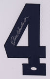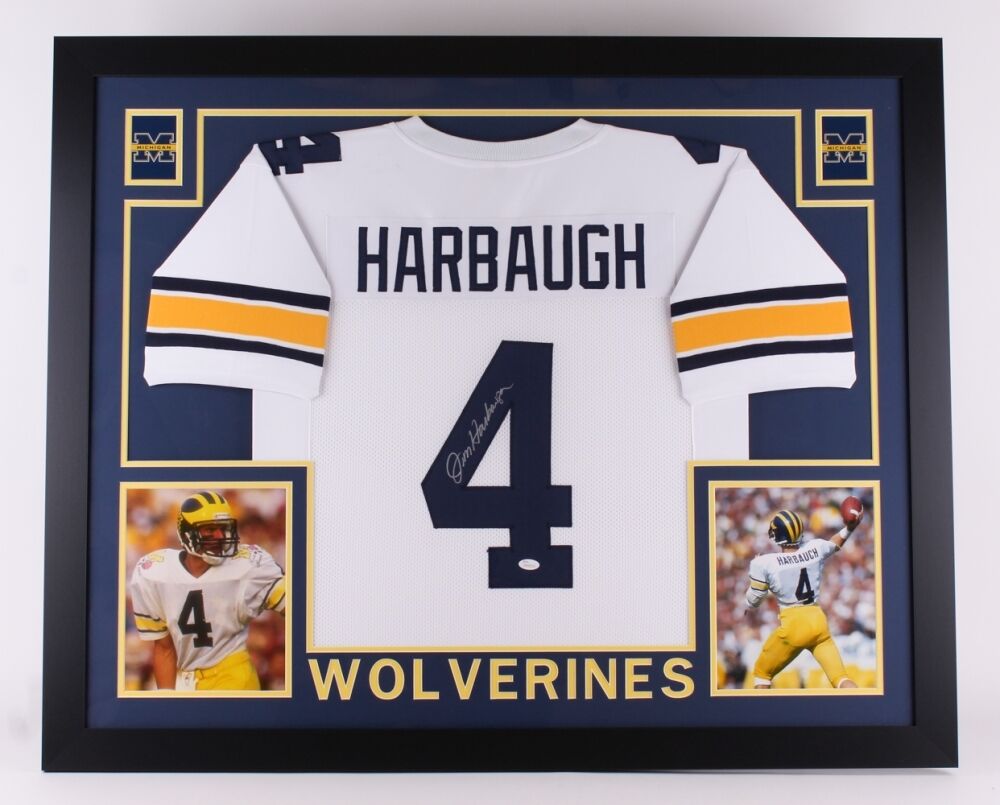 Custom frame measures approximately 35" x 43" in size and features a jersey which has been hand-signed in silver paint pen by Jim Harbaugh (Bears).The autograph includes an official James Spence Authentication (JSA) hologram and matching COA for authenticity purposes. The signing of this item was witnessed by JSA.Authentication: JSA COA