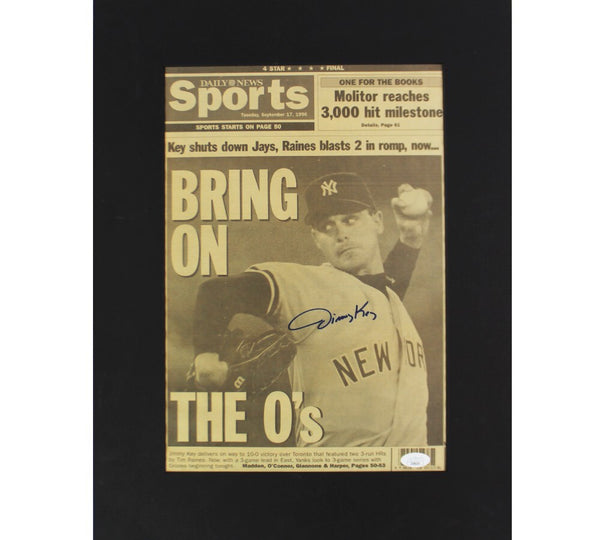 A New York Yankees "Daily News Sports" Newspaper with Mating hand signed by Jimmy Key. The item and signature are in excellent condition. Jimmy is a five-time All-Star lefty who won 186 games over 15 MLB seasons, led the AL in ERA in 1987 and wins in 1994, and earned World Series victories with the Blue Jays in 1992 and Yankees in 1996. AUTHENTICATION: The item is accompanied by a JSA Certificate of Authenticity - JSA Serial Numbered and Databased Hologram