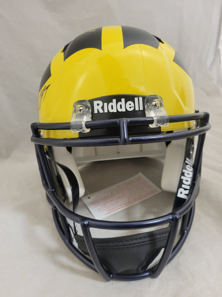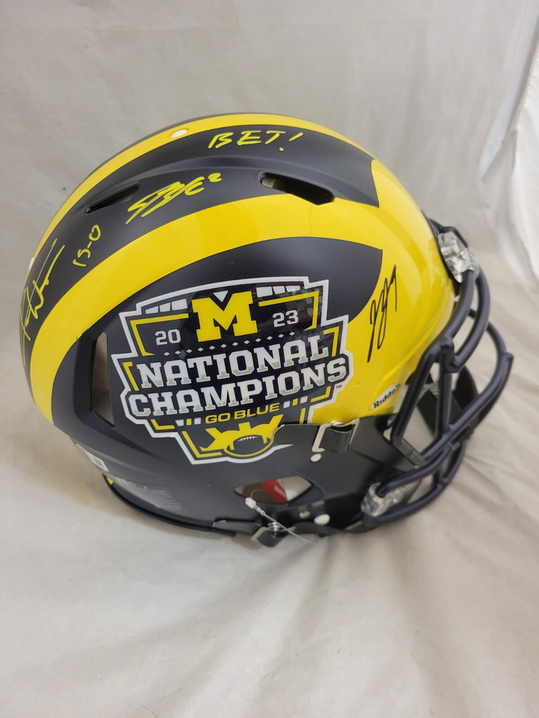 JJ McCARTHY, BLAKE CORUM AND ROMAN WILSON TRIPLE AUTOGRAPHED / SIGNED MICHIGAN WOLVERINES NATIONAL CHAMPIONS LOGO FULL SIZE SPEED AUTHENTIC HELMET"BET" (CORUM)"15-0" (WILSON)INSCRIPTIONSBECKETT QR CODE HOLOGRAM COA