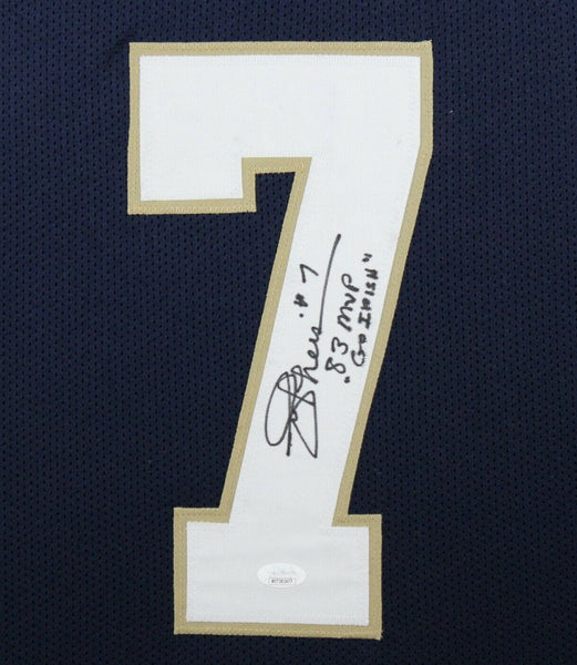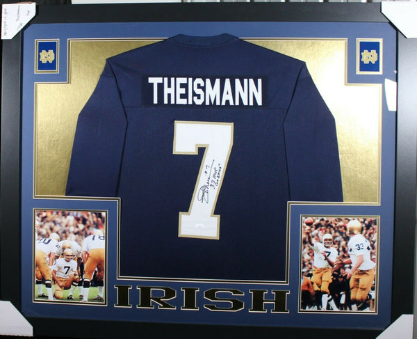 JOE THEISMANN AUTOGRAPHED & PROFESSIONALLY FRAMED PRO-STYLE JERSEY(Occasionally our own stock pictures are used at times due to quantity of framing, all frames will look identical as the one pictured)Item is accompanied with a Certificate of Authenticity issued by JSA and corresponding tamper proof hologram on the jersey.THE FRAMED JERSEY MEASURES 35"x 44" & COMES WITH THE FOLLOWING:-UV Protected Acrylic-Triple Acid Free Team Colored Matting-2 High Quality 8"x10" Photos-Team Logo