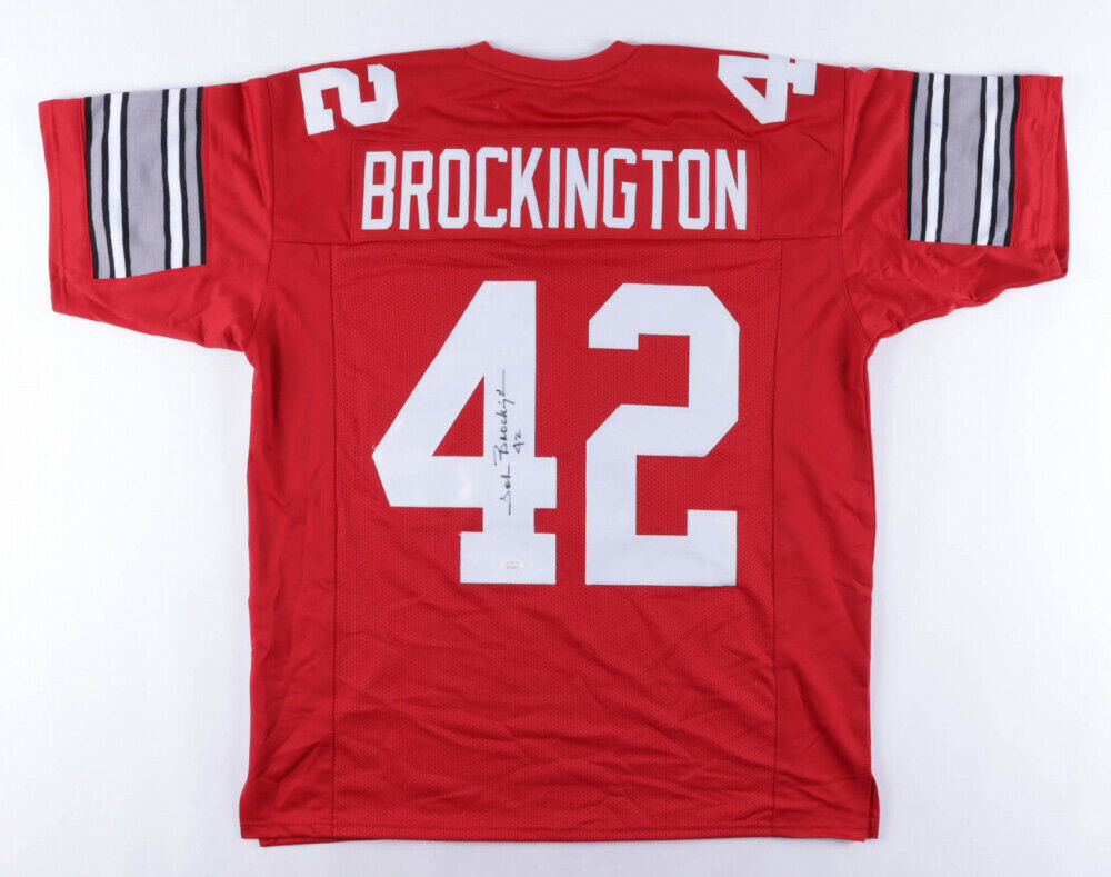 Custom on-field style jersey. Everything sewn on, size XL. Has been hand-signed by John Brockington.The lot / autograph(s) includes an official James Spence Authentication (JSA) hologram and matching COA for authenticity purposes. The signing of this item was witnessed by JSA.Authentication: JSA COA