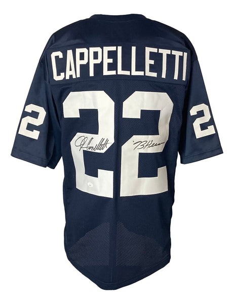 Featured is a John Cappelletti signed custom football jersey, inscribed "73 Heisman". This jersey has been hand signed by Cappelletti and comes with the JSA witnessed hologram and certificate of authenticity. This jersey features professionally sewn letters and numbers and is size XL. This jersey has no team tags or emblems and is intended as a sports collectible. This jersey would make a great addition to any sports memorabilia collection! SPECIFICATIONS Autographed By: John Cappelletti Team: Penn State Sport: Football Authentication: James Spence Authentication (JSA)