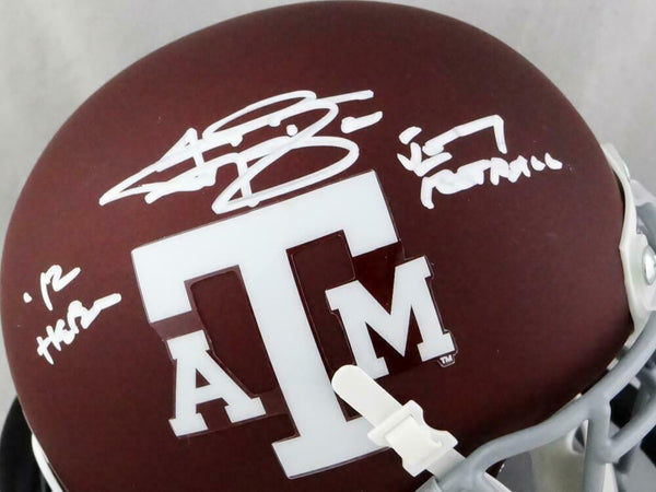 Johnny Manziel Autographed Texas A&M Maroon Schutt Mini Helmet w/ 2 Insc - JSA W Auth *Right This is a hand autographed Mini Helmet of Johnny Manziel of the Texas A&M Aggies. This item is inscribed with Heisman 12 and Johnny Fucking Football. This is a Schutt Football Mini Helmet. This item has a James Spence Witness Protection Authentication, which comes with a numbered sticker and a matching JSA Certificate of Authenticity. You can view this item on the SpenceLOA website and it shows when and where the item was signed. It was signed either at a public autograph appearance or a private signing. This is a stock photo of the item. Although you may not receive this exact item, the item you receive is virtually identical and brand new in great shape.