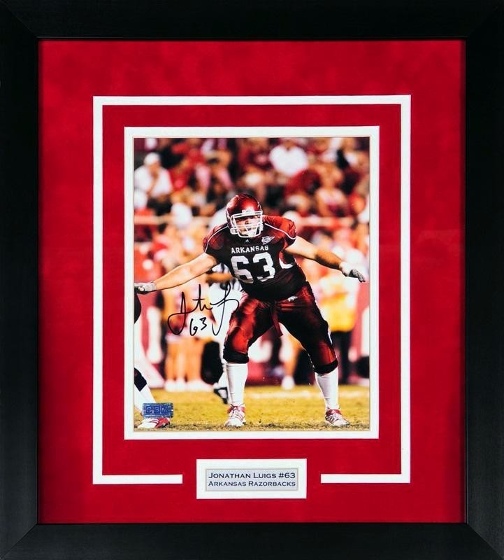 Jonathan Luigs, former All-American center for the Arkansas Razorbacks, has hand signed this 8x10 photo at a private signing. It comes professionally framed in a black wood frame and double matted in Arkansas colors. This item comes with a certificate of authenticity (COA) from Signature Sports Marketing, one of the leaders in the industry. You will receive a paper COA along with matching serial-numbered holograms.Item pictured may not be the exact item you will receive. It will be similar quality, and we guarantee your satisfaction.