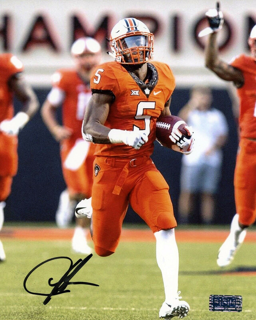 Justice Hill, former star running back for the Oklahoma State Cowboys, has hand signed this 8x10 photo at a private signing. This item comes with a certificate of authenticity (COA) from Signature Sports Marketing, one of the leaders in the industry. You will receive a paper COA along with matching serial-numbered holograms.Item pictured may not be the exact item you will receive. It will be similar quality, and we guarantee your satisfaction.