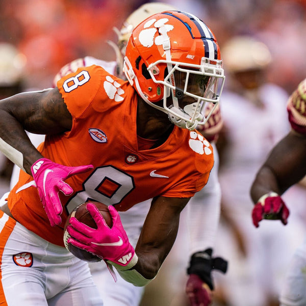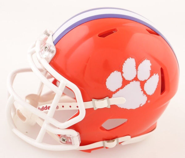 Riddell Clemson Tigers speed mini helmet. Hand-signed and inscribed by Justyn Ross.The lot / autograph(s) includes an official Beckett Authentication Services serially-numbered hologram and matching COA for authenticity purposes.Authentication: Beckett COA