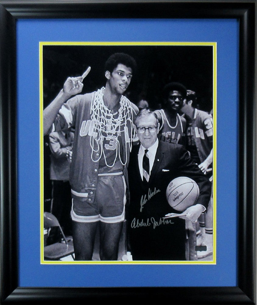 A Framed UCLA 16x20 Photo hand signed by Kareem Abdul-Jabbar & John Wooden. The item and signatures are in excellent condition - Kareem is a 6x NBA Champion, 6x MVP and 1970 NBA Rookie of the Year. John was successful both on and off the court - winning numerous awards, such as 5x AP Coach of the Year. - AUTHENTICATION: The item features a Certificate of Authenticity and Serial Numbered and Databased Hologram.