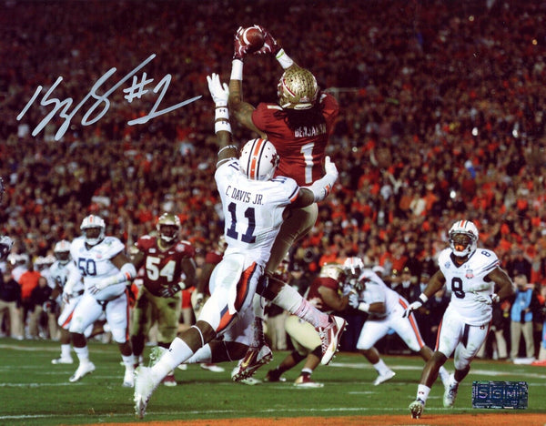 Kelvin Benjamin, former All-American wide receiver for the Florida State Seminoles, has hand signed this 8x10 photo of his game winning touchdown catch in the national championship game. This item comes with a certificate of authenticity (COA) from Signature Sports Marketing, one of the leaders in the industry. You will receive a paper COA along with matching serial-numbered holograms.Item pictured may not be the exact item you will receive. It will be similar quality, and we guarantee your satisfaction.