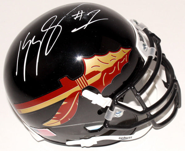 Schutt Florida State Seminoles mini helmet. Hand-signed and inscribed in white paint pen by Kelvin Benjamin (Bills). The lot / autograph(s) includes an official James Spence Authentication (JSA) hologram and matching COA for authenticity purposes. The signing of this item was witnessed by JSA. Also comes with a proof picture from the signing.Authentication: JSA COA