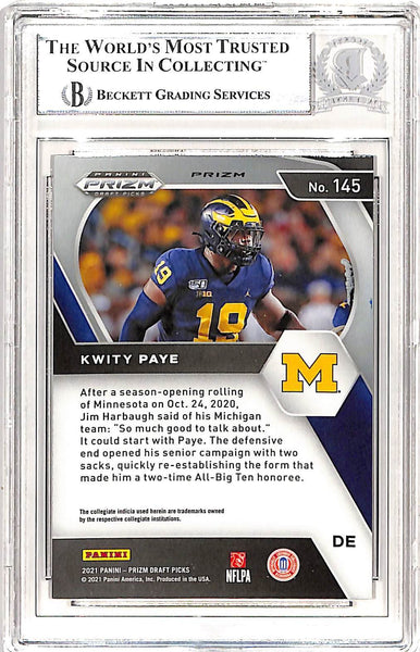 Kwity Paye Autographed Prizm Orange #145 Trading Card Slabbed Beckett 38931 The number in the listing title is just an inventory sku for our records and is not the authentication number. The item pictured is a stock photo unless otherwise noted. This is a 2021 Prizm Orange #145 Slabbed Trading Card that was personally autographed by Kwity Paye. Includes a certificate of authenticity from Beckett Authentication Services (BAS) and Denver Autographs.