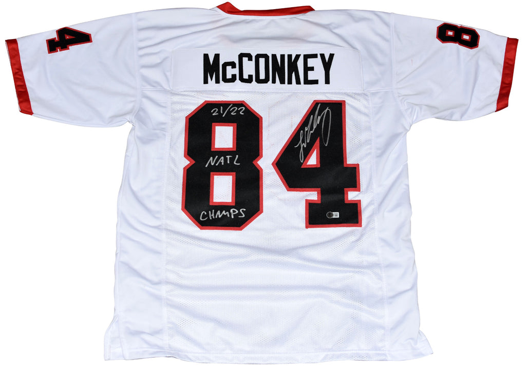 Ladd McConkey, former star wide receiver for the Georgia Bulldogs, has hand signed this white custom jersey at a private signing. He included the inscription "21/22 Natl Champs". Jersey is size XL and all letters/numbers are sewn-on. This item is authenticated by Beckett Authentication Services and was signed in the presence of one of their representatives. Their tamper-evident hologram featuring a QR code and serial number is on the item. The authenticity can be verified online by entering the serial number or scanning the QR code.Item pictured may not be the exact item you will receive. It will be similar quality, and we guarantee your satisfaction.