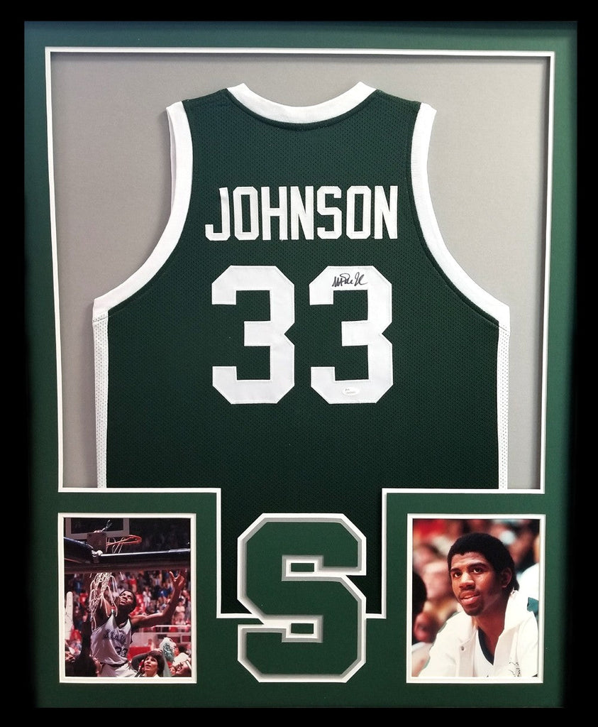 A Michigan State Spartans Green Custom NCAA Jersey hand signed by Magic Johnson. The item and signature are in excellent condition. Magic is a 5x NBA Champion, 3x NBA Finals MVP, 3x NBA Most Valuable Player, 12x NBA All-Star, 9x ALL-NBA First Team, and Class of 2002 NBA Hall of Fame Inductee. Don't miss out on this excellent piece from a true legend! The framed jersey also features two 8x10 shots of Magic. The frame measures 42x34. AUTHENTICATION: The jersey is accompanied by a JSA Certificate of Authenticity - JSA Serial Numbered and Databased Hologram.