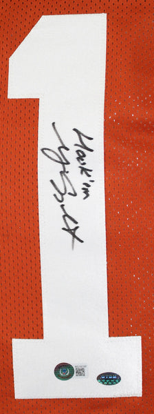 Major Applewhite Autographed Orange College Style Jersey w/Hook Em- Beckett Hologram *Black THIS IS NOT AN NCAA JERSEY. THIS HAS NO TAGS, NO LOGOS, NO EMBLEMS. This is a hand autograph of Major Applewhite on a Custom Made (non name brand) Authentic Style Jersey with stitched letters and numbers and inscribed with Hook Em. This item has a Beckett Authentication, which comes with a Beckett numbered hologram and a QR code for verification. You can view this item on the Beckett website and it shows when and where the item was signed. It was signed either at a public autograph appearance or a private signing. This is a stock photo of the item. Although you may not receive this exact item, the item you receive is virtually identical and brand new in great shape. Jersey size is XL.