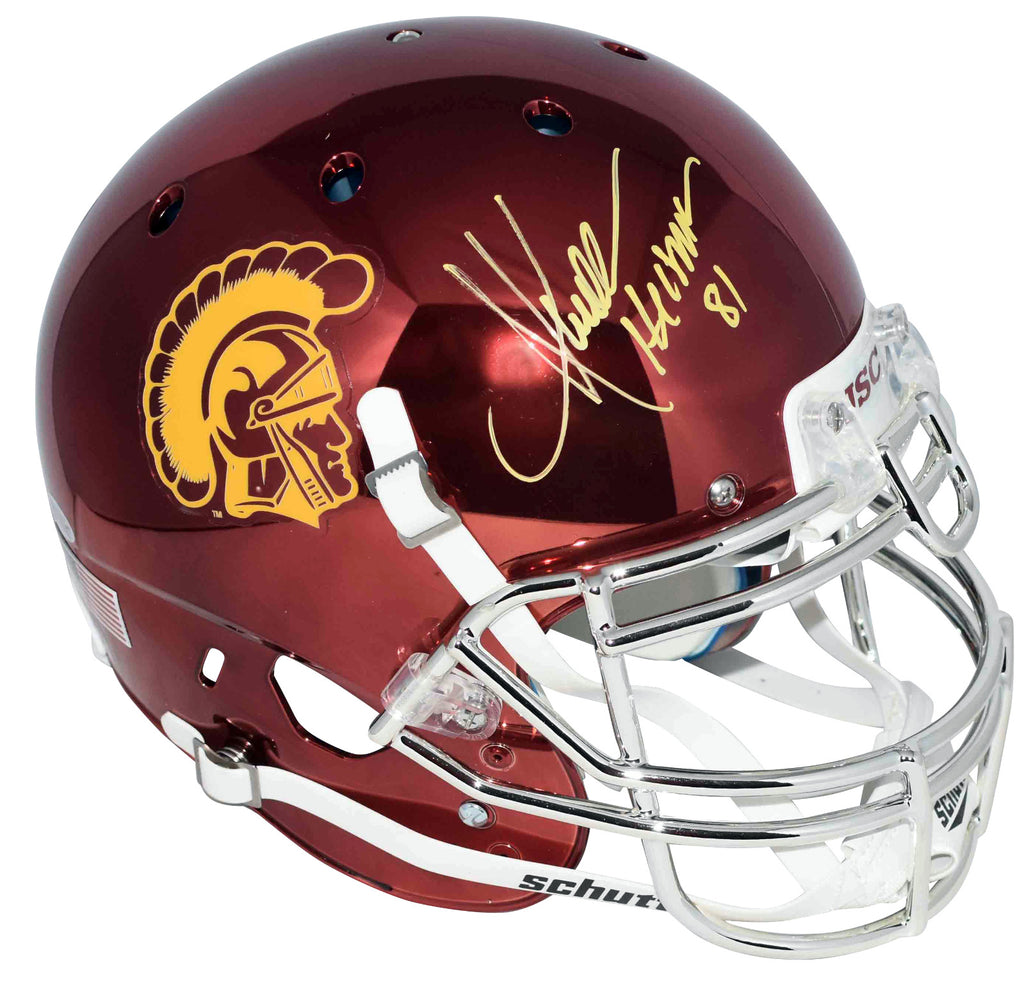 Marcus Allen, former Heisman Trophy winning running back for the Trojans, has hand signed this USC Schutt Chrome full-size authentic helmet at a private signing. He included the inscription "Heisman 81". This helmet is fully padded inside like the ones worn on the field. This item comes with a certificate of authenticity (COA) from Beckett Authentication Services and was signed in the presence of one of their representatives. You will receive a serial-numbered COA along with a matching serial-numbered sticker on the helmet. The authenticity can be verified online by entering the serial number.Item pictured may not be the exact item you will receive. It will be similar quality, and we guarantee your satisfaction.