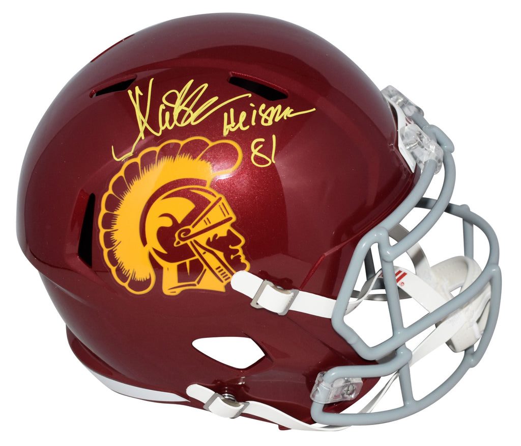 Marcus Allen, former Heisman Trophy winning running back for the Trojans, has hand signed this USC Riddell Speed full-size replica helmet at a private signing. He included the inscription "Heisman 81". This item is authenticated by Beckett Authentication Services and was signed in the presence of one of their representatives. Their tamper-evident hologram featuring a QR code and serial number is on the item. The authenticity can be verified online by entering the serial number or scanning the QR code.Item pictured may not be the exact item you will receive. It will be similar quality, and we guarantee your satisfaction.