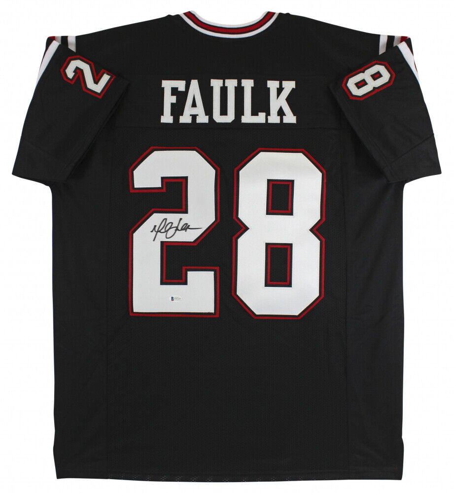 Custom on-field style jersey. Everything is sewn on, size XL. Hand-signed by Marshall Faulk (HOF).The lot / autograph(s) includes an official Beckett Authentication Services serially-numbered hologram and matching COA for authenticity purposes. The signing of this item was witnessed by Beckett.Authentication: Beckett COA