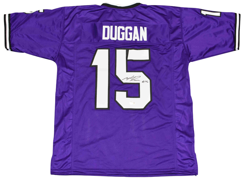 Max Duggan, former star quarterback for the TCU Horned Frogs, has hand signed this purple custom jersey at a private signing. Jersey is size XL and all letters/numbers are sewn-on. This item is authenticated by Beckett Authentication Services and was signed in the presence of one of their representatives. Their tamper-evident hologram featuring a QR code and serial number is on the item. The authenticity can be verified online by entering the serial number or scanning the QR code.Item pictured may not be the exact item you will receive. It will be similar quality, and we guarantee your satisfaction.