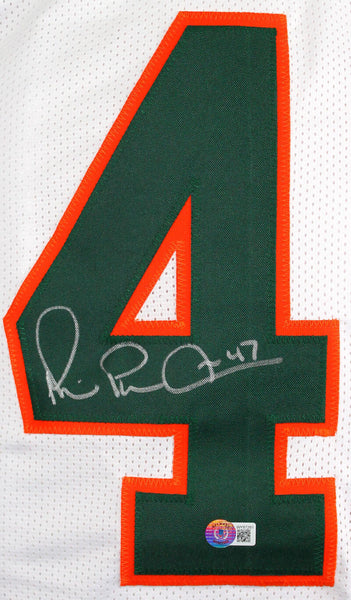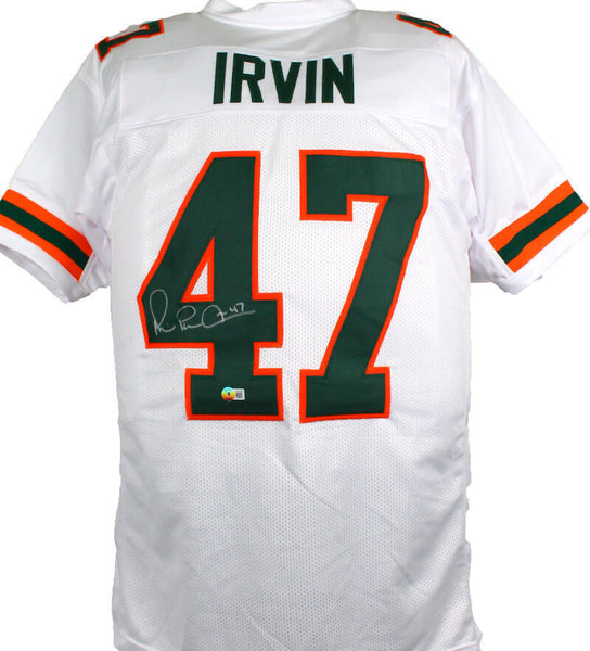 THIS IS NOT AN NCAA JERSEY. THIS HAS NO TAGS, NO LOGOS, NO EMBLEMS. This is a hand autograph of Michael Irvin of the University of Miami on a Custom Made (non-name brand) Authentic Style Jersey with stitched letters and numbers. This item has a Beckett Witnessed Authentication, which comes with a Beckett numbered sticker hologram and a QR Code for verification. You can view this item on the Beckett Authentication website. It was signed either at a public autograph appearance or a private signing. This is a stock photo of the item. Although you may not receive this exact item, the item you receive is virtually identical and brand new in great shape. Jersey size is XL. THIS IS NOT AN NCAA JERSEY. THIS HAS NO TAGS, NO LOGOS, NO EMBLEMS. This is a hand autograph of Michael Irvin of the University of Miami on a Custom Made (non-name brand) Authentic Style Jersey with stitched letters and numbers. This item has a Beckett Witnessed Authentication, which comes with a Beckett numbered sticker hologram and a QR Code for verification. You can view this item on the Beckett Authentication website. It was signed either at a public autograph appearance or a private signing. This is a stock photo of the item. Although you may not receive this exact item, the item you receive is virtually identical and brand new in great shape. Jersey size is XL.