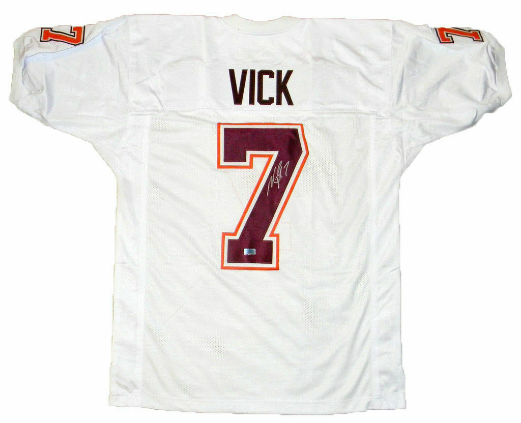 Michael Vick, former All-American quarterback for the Virginia Tech Hokies, has hand signed this white custom jersey at a private signing. Jersey is size XL and all letters/numbers are sewn-on. This item comes with a certificate of authenticity (COA) from Signature Sports Marketing, one of the leaders in the industry. You will receive a paper COA along with matching serial-numbered holograms.Item pictured may not be the exact item you will receive. It will be similar quality, and we guarantee your satisfaction.