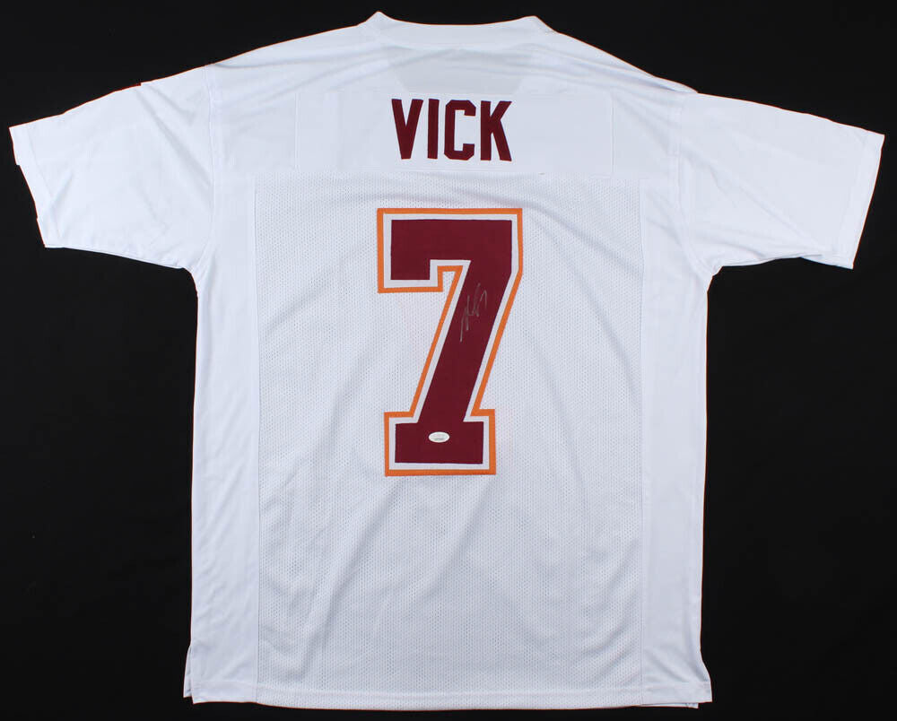Custom on-field style jersey. Everything is sewn on, size XL. Hand-signed in silver felt-tip pen by Michael Vick (Falcons). The lot / autograph(s) includes an official James Spence Authentication (JSA) hologram and matching COA for authenticity purposes. The signing of this item was witnessed by JSA.Authentication: JSA COA