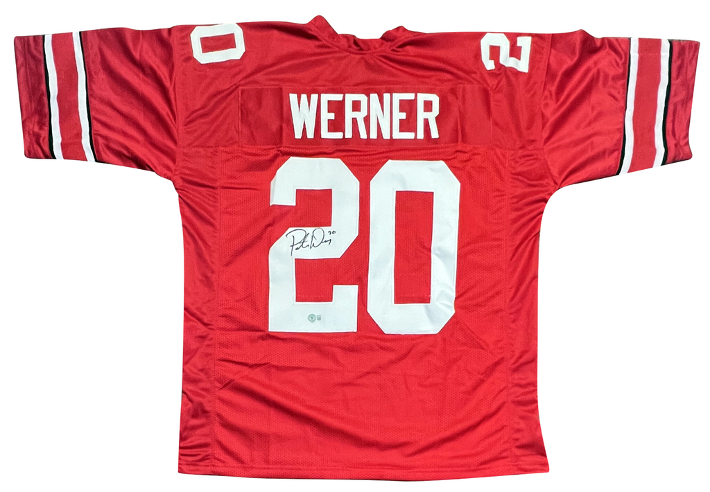Pete Werner, former star linebacker for the Ohio State Buckeyes, has hand signed this red custom jersey. Jersey is size L and all letters/numbers are sewn-on. This item is authenticated by Beckett Authentication Services and was signed in the presence of one of their representatives. Their tamper-evident hologram featuring a QR code and serial number is on the item. The authenticity can be verified online by entering the serial number or scanning the QR code.Item pictured may not be the exact item you will receive. It will be similar quality, and we guarantee your satisfaction.