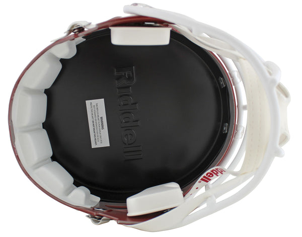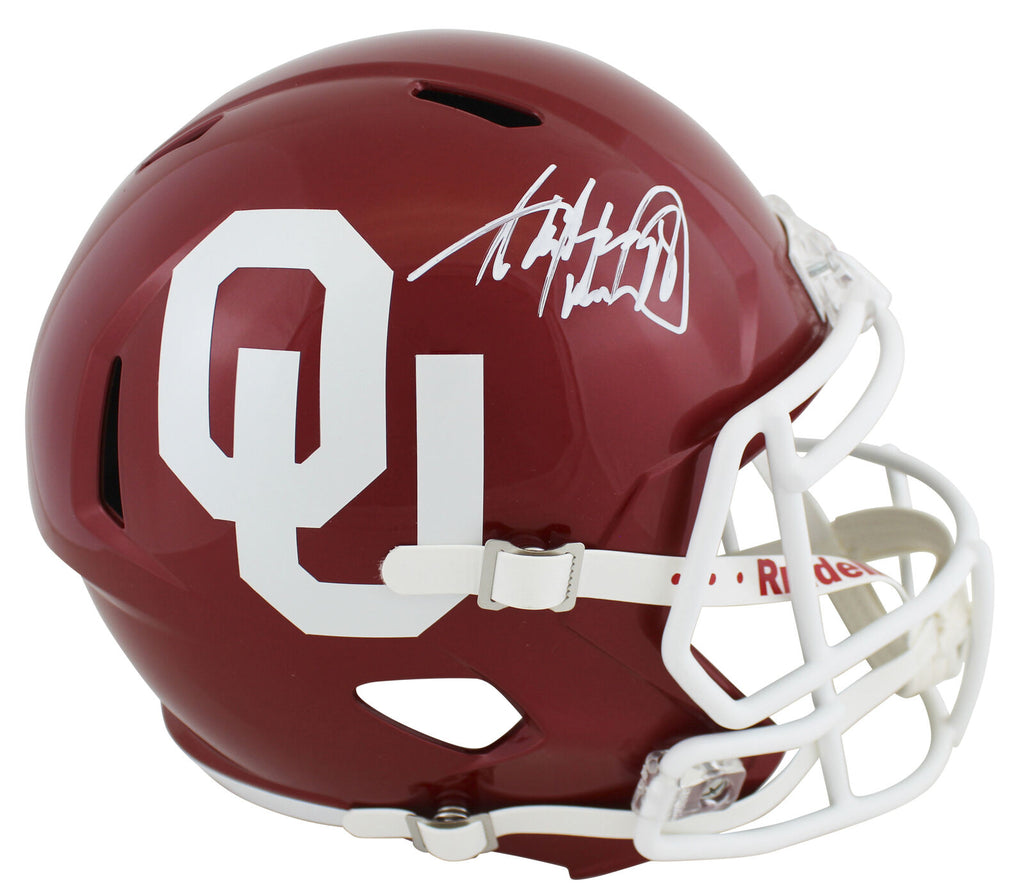 This Autographed Full Size Speed Rep Helmet has been Personally Signed by Adrian Peterson of the Oklahoma Sooners. This item is 100% Authentic to include a hologram by Beckett Authentication Services. This item will come with the new Beckett Authentication hologram that has a scannable QR code rather than the traditional COA. If you would like to have a COA, you are welcome to reach out to Beckett for a printed certification once you receive your item. This is a BAS Witnessed Protection Program item which means a Beckett Authentication Service representative was present when this item was being signed. We conducted an autograph signing with Adrian Peterson where multiples of the same item were signed. While the photographs are representative of this item, the size, placement and strength of the signature may vary. Each item is hand signed, therefore, each autograph is unique. This item can be verified through BAS Witnessed.