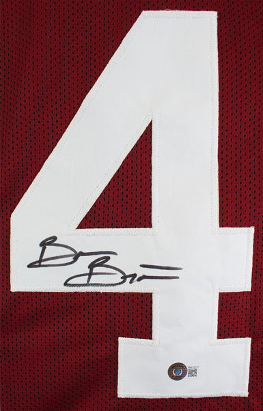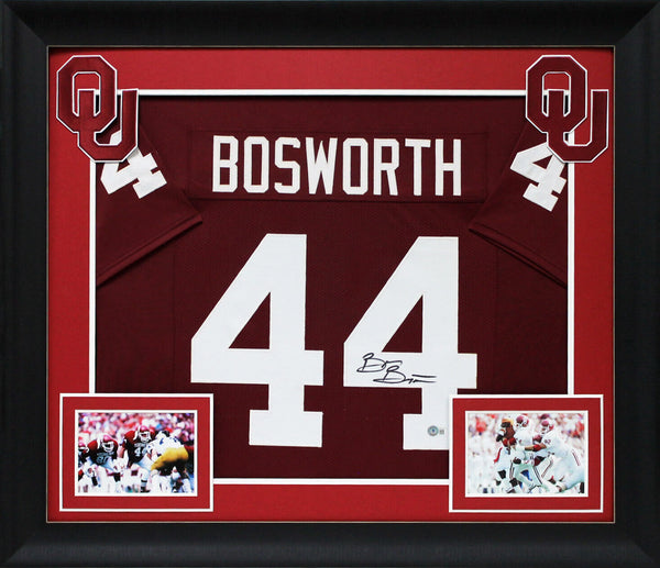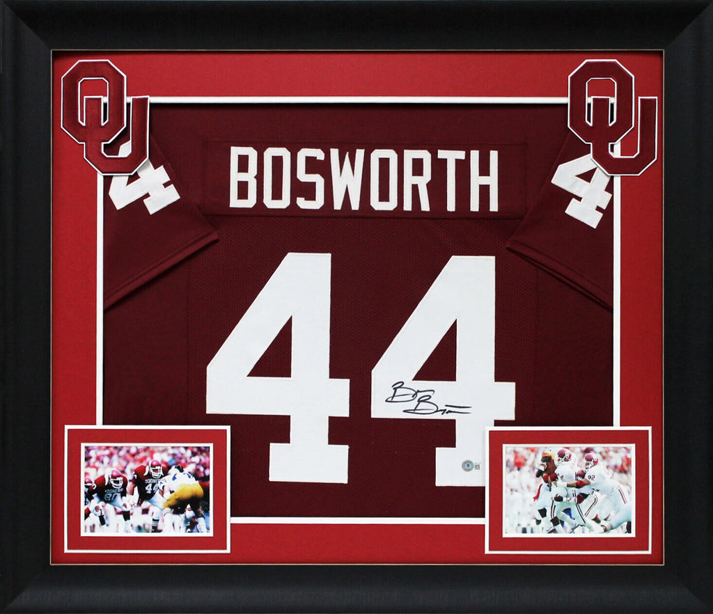 This Autographed Maroon Pro Style Framed Jersey has been Personally Signed by Brian Bosworth of the Oklahoma Sooners. This item is 100% Authentic to include a hologram by Beckett Authentication Services. This item will come with an affixed Beckett Authentication Services (BAS) authentication sticker, which includes a scannable QR code to verify authenticity. Please note that Beckett no longer provides serial-numbered COA cards, and the attached BAS sticker will serve as the complete authentication for this item. This is a BAS Witnessed Protection Program item which means a Beckett Authentication Service representative was present when this item was being signed. We conducted an autograph signing with Brian Bosworth where multiples of the same item were signed. While the photographs are representative of this item, the size, placement and strength of the signature may vary. Each item is hand signed, therefore, each autograph is unique. This item can be verified through BAS Witnessed. This item has been professionally framed to overall dimensions of approximately 32 x 37 inches. This is a X-Large sized, non-branded, custom-stitched Framed Jersey. This jersey will be framed to order, it will take 3-4 days from purchase date for it to ship.