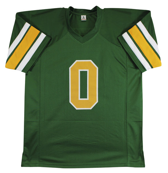 This Autographed Green Pro Style Jersey has been Personally Signed by Bucky Irving of the Oregon Ducks. This item is 100% Authentic to include a hologram by Beckett Authentication Services. This item will come with an affixed Beckett Authentication Services (BAS) authentication sticker, which includes a scannable QR code to verify authenticity. Please note that Beckett no longer provides serial-numbered COA cards, and the attached BAS sticker will serve as the complete authentication for this item. This is a BAS Witnessed Protection Program item which means a Beckett Authentication Service representative was present when this item was being signed. We conducted an autograph signing with Bucky Irving where multiples of the same item were signed. While the photographs are representative of this item, the size, placement and strength of the signature may vary. Each item is hand signed, therefore, each autograph is unique. This item can be verified through BAS Witnessed. This is a X-Large sized, non-branded, custom-stitched Jersey.