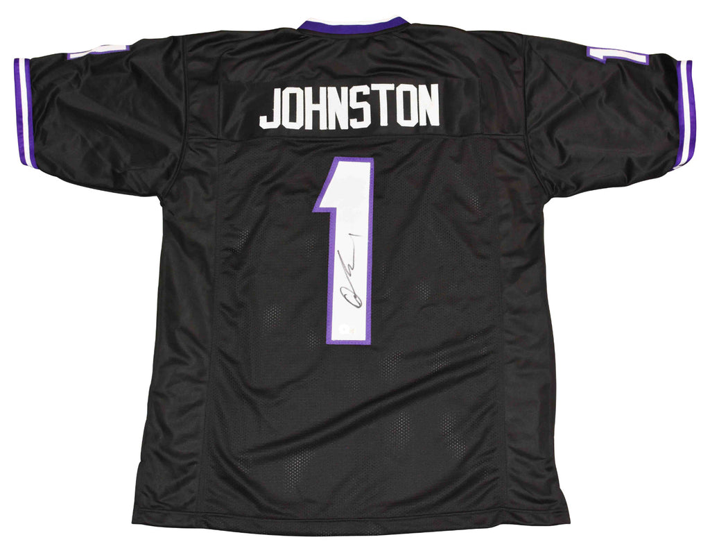 Quentin Johnston, former star wide receiver for the TCU Horned Frogs, has hand signed this black custom jersey at a private signing. Jersey is size XL and all letters/numbers are sewn-on. This item is authenticated by Beckett Authentication Services and was signed in the presence of one of their representatives. Their tamper-evident hologram featuring a QR code and serial number is on the item. The authenticity can be verified online by entering the serial number or scanning the QR code.Item pictured may not be the exact item you will receive. It will be similar quality, and we guarantee your satisfaction.