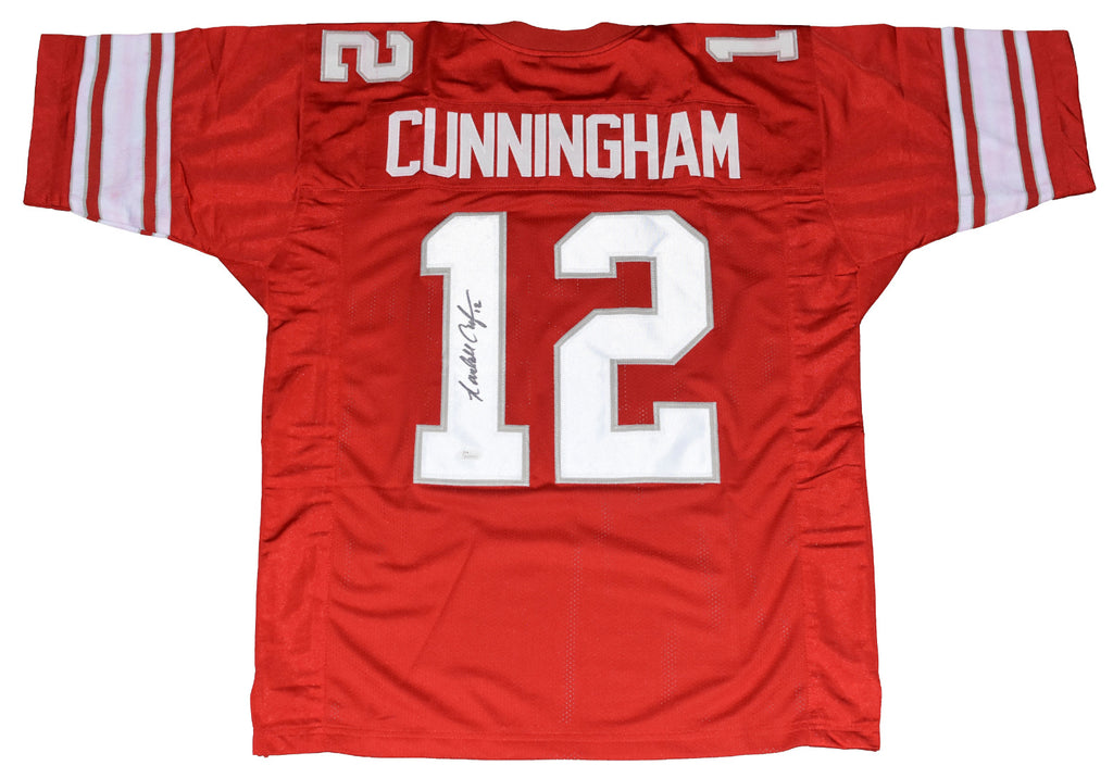 Randall Cunningham, former star quarterback for the UNLV Rebels, has hand signed this red custom jersey at a private signing. Jersey is size XL and all letters/numbers are sewn-on. This item comes with a certificate of authenticity (COA) from JSA - James Spence Authentication and was signed in the presence of one of their representatives. You will receive a serial-numbered COA along with a matching serial-numbered sticker on the jersey. The authenticity can be verified online by entering the serial number.Item pictured may not be the exact item you will receive. It will be similar quality, and we guarantee your satisfaction.