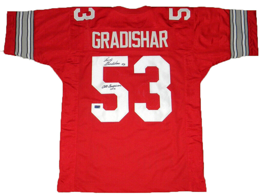 Randy Gradishar, former All-American linebacker for the Ohio State Buckeyes, has hand signed this red custom jersey at a private signing. He included the inscription "All-American 2x". Jersey is size XL and all letters/numbers are sewn-on. This item comes with a certificate of authenticity (COA) from Signature Sports Marketing, one of the leaders in the industry. You will receive a paper COA along with matching serial-numbered holograms.Item pictured may not be the exact item you will receive. It will be similar quality, and we guarantee your satisfaction.