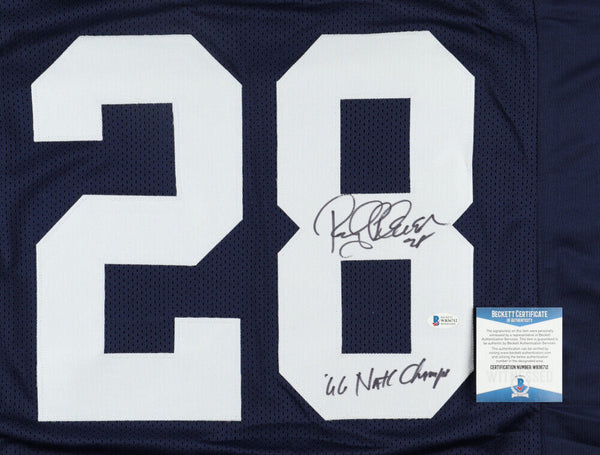 Custom on-field style jersey. Everything sewn on, size XL. Hand-signed and inscribed in black felt-tip pen by Rocky Bleier. The lot / autograph(s) includes an official Beckett Authentication Services serially-numbered hologram and matching COA for authenticity purposes. The signing of this item was witnessed by Beckett.Authentication: Beckett COA