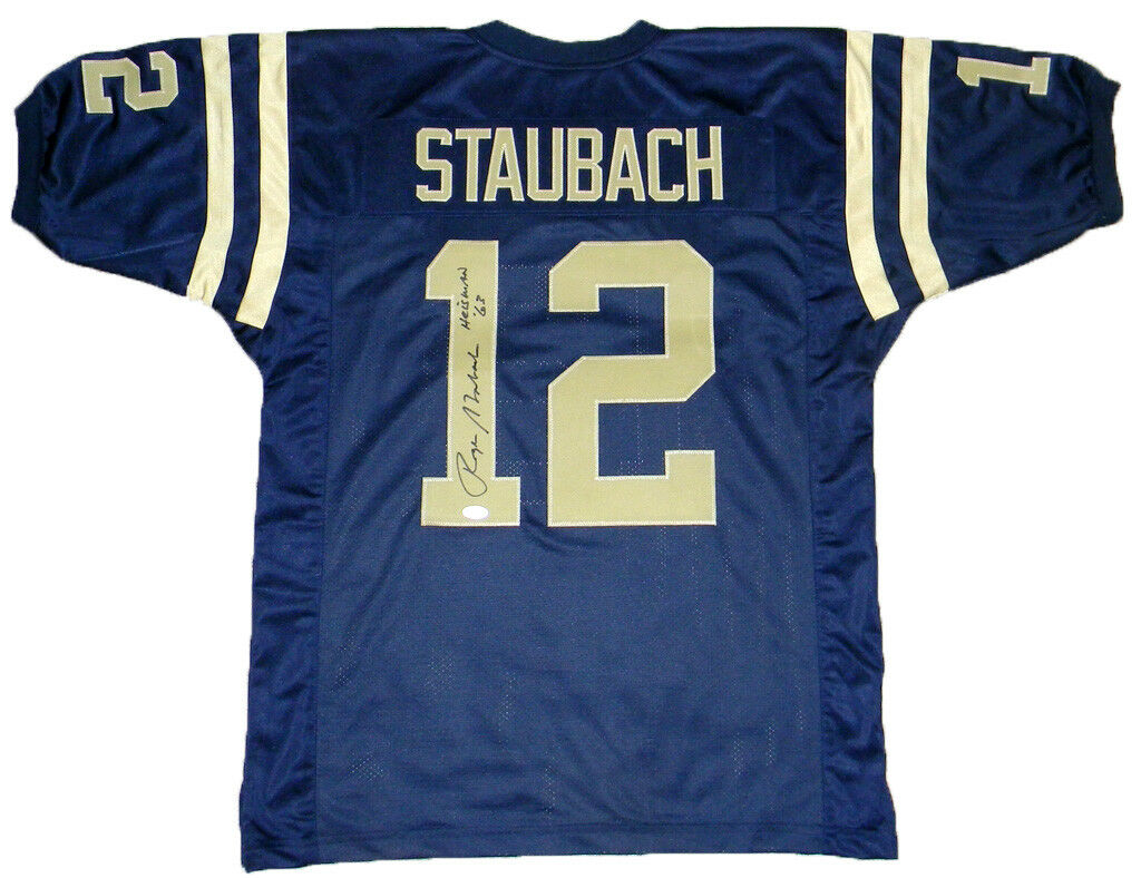 Roger Staubach, former Heisman Trophy winning quarterback for the Navy Midshipmen, has hand signed this navy custom jersey at a private signing. He included the inscription "Heisman 63" with his signature. Jersey is size XL and all letters/numbers are sewn-on. This item comes with a certificate of authenticity (COA) from JSA - James Spence Authentication and was signed in the presence of one of their representatives. You will receive a serial-numbered COA along with a matching serial-numbered sticker on the jersey. The authenticity can be verified online by entering the serial number.Item pictured may not be the exact item you will receive. It will be similar quality, and we guarantee your satisfaction.