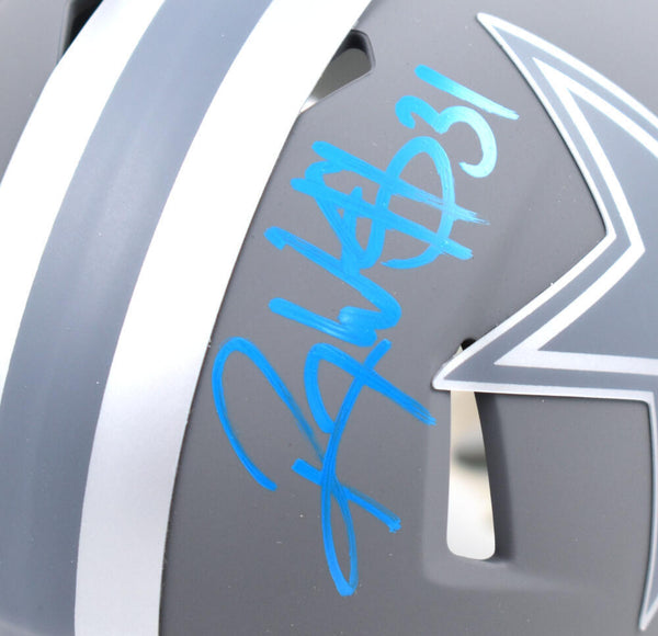 Roy Williams Autographed Dallas Cowboys Slate Speed Mini Helmet-Beckett W Hologram *Blue This is a hand autograph of Roy Williams of the Dallas Cowboys on a Riddell Football Slate Speed Mini Helmet. This item has a Beckett Witness Authentication, which comes with a Beckett numbered hologram and a QR code for verification. You can view this item on the Beckett Authentication website and it shows when and where the item was signed. It was signed either at a public autograph appearance or a private signing. This is a stock photo of the item. Although you may not receive this exact item, the item you receive is virtually identical and brand new in great shape.