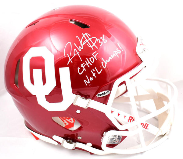 Roy Williams Autographed Oklahoma Sooners F/S Speed Authentic Helmet w/2 Inscriptions- Beckett W Hologram *White This is a Hand Autograph of Roy Williams of the Oklahoma Sooners on a Riddell Football Full Size Authentic Speed Helmet. Inscribed National Champs, CFHOF. This item has a Beckett Witness Authentication, which comes with a Beckett numbered hologram and a QR code for verification. You can view this item on the Beckett Authentication website, it shows when and where the item was signed. It was signed either at a public autograph appearance or a private signing. This is a stock photo of the item. Although you may not receive this exact item, the item you receive is virtually identical and brand new in great shape.